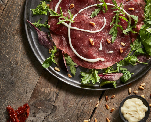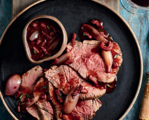 Rosbief met gesmoorde sjalotten in rodewijnsaus